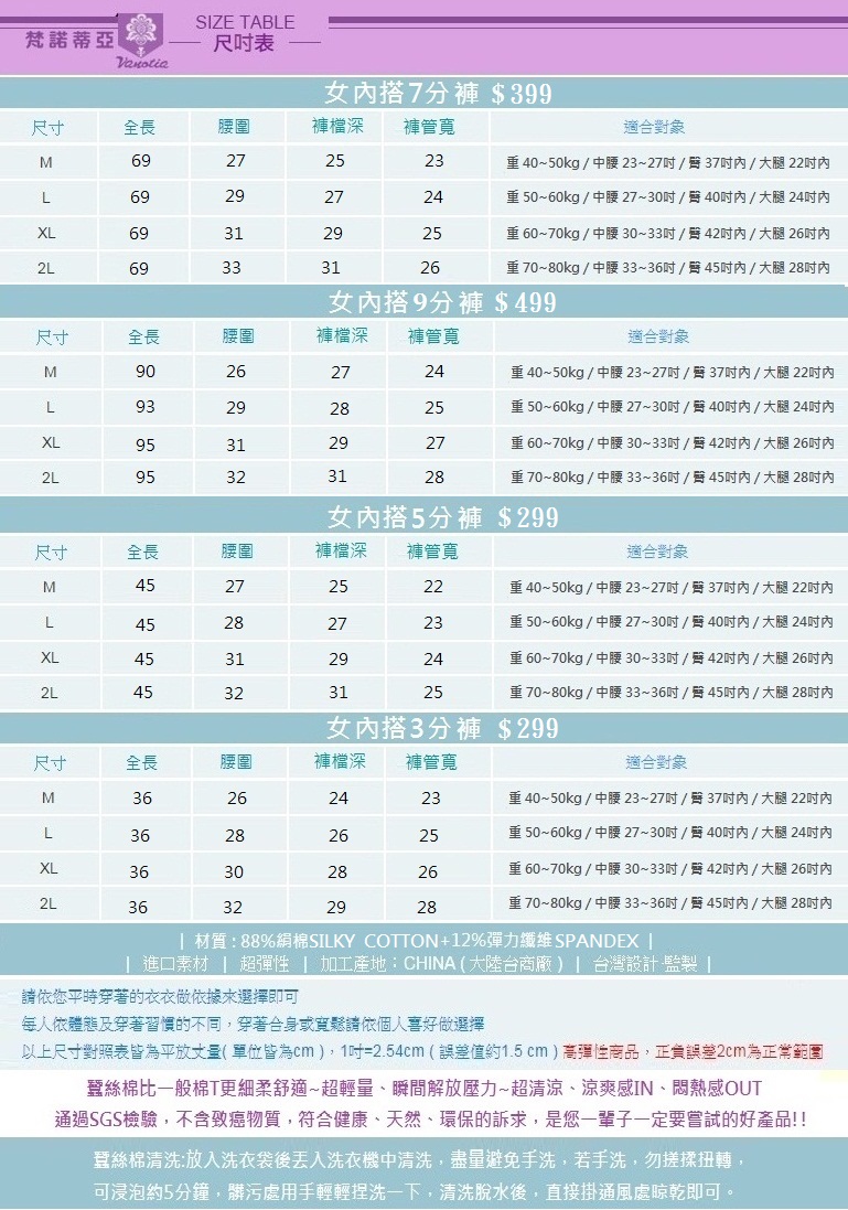 女 蠶絲棉  3、5、7、9分內搭褲 系列